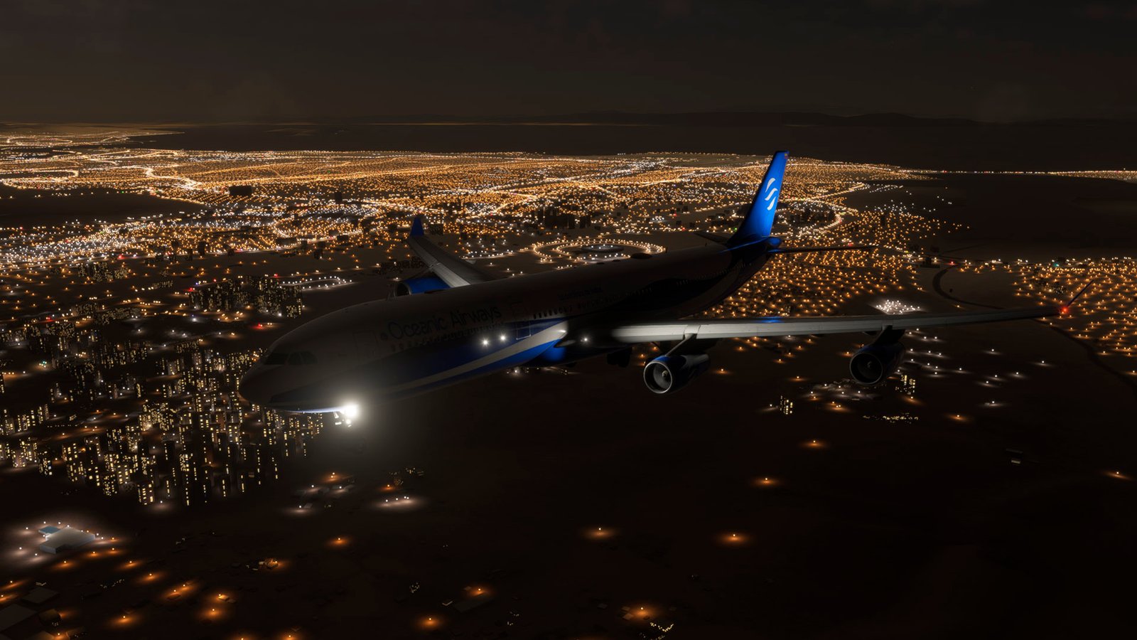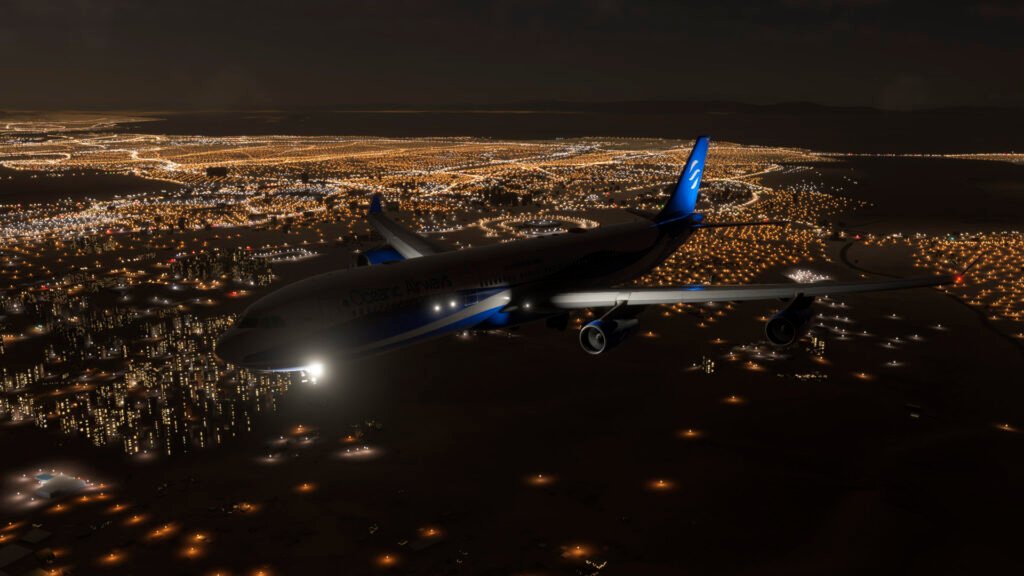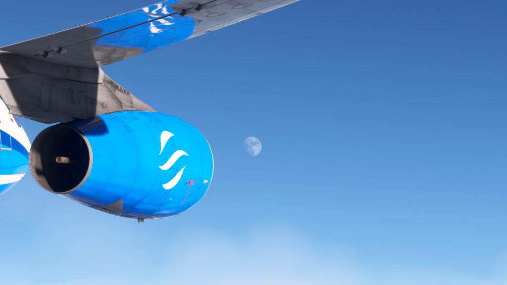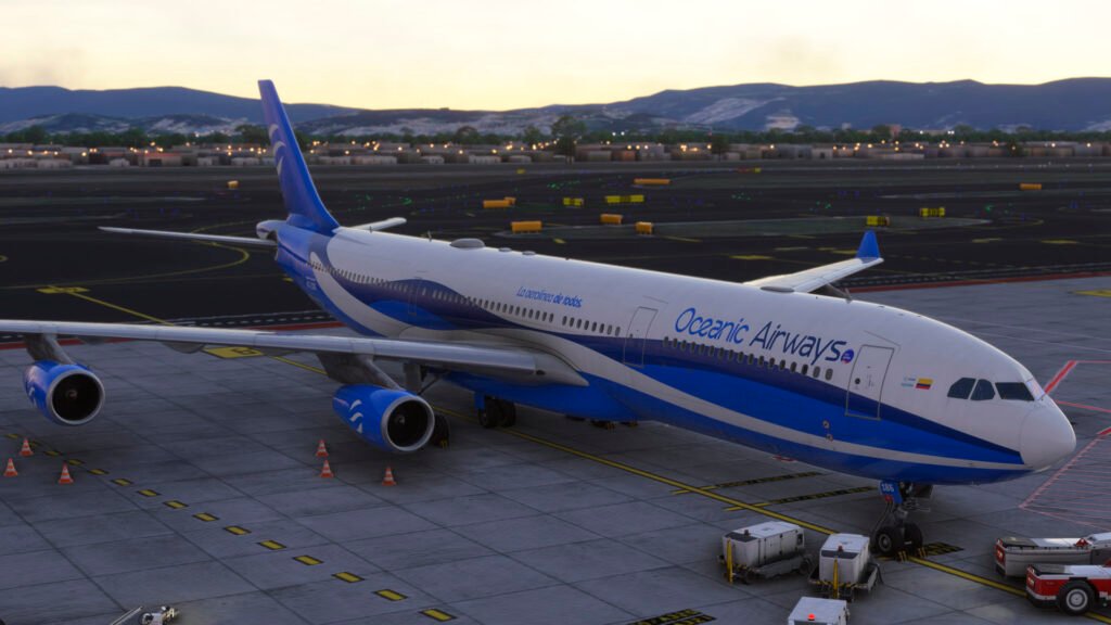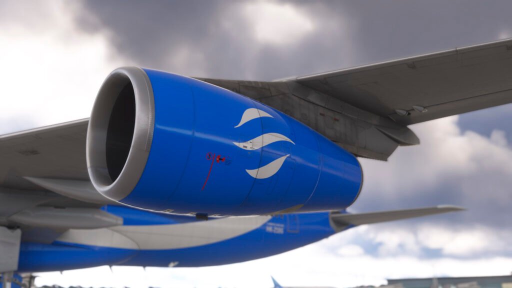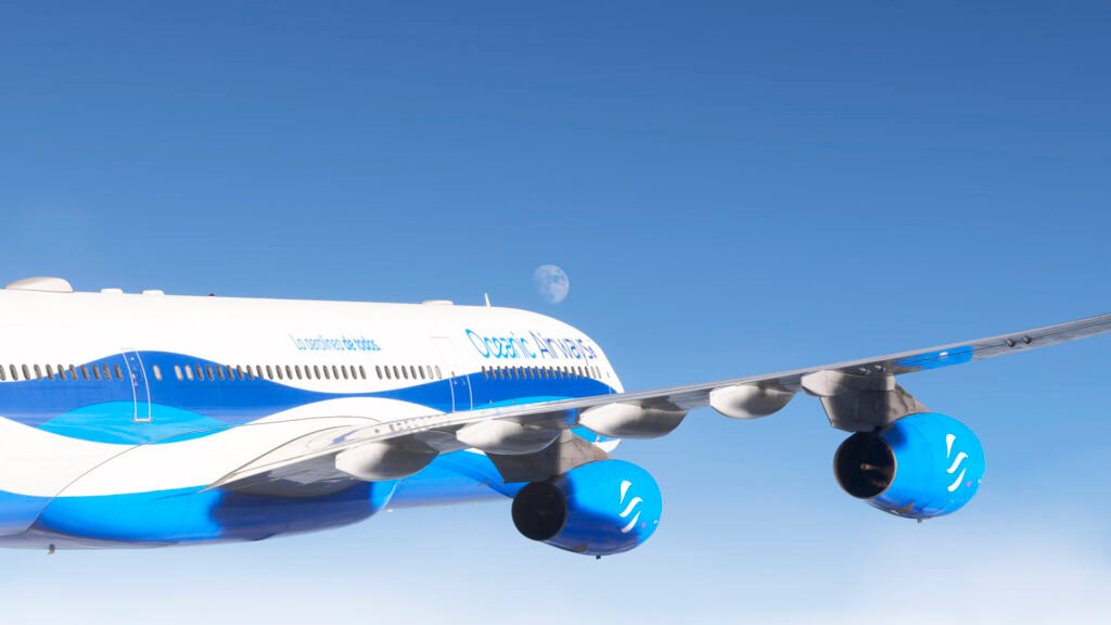 Los artistas de Oceanic Airways han aprovechado al máximo las texturas PBR y el modelado de alta resolución del iniBuilds A340, logrando un acabado que brilla con reflejos naturales bajo distintas condiciones de luz. Las superficies metálicas responden de forma realista al sol del amanecer o del atardecer, mientras que el contraste de los colores corporativos resalta sobre cualquier escenario del simulador.